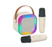 Con un diseño compacto, colorido y fácil de usar, este parlante incluye 2 micrófonos recargables, efectos de cambio de voz y luces LED que se pueden apagar si lo deseas. ¡La diversión está garantizada!